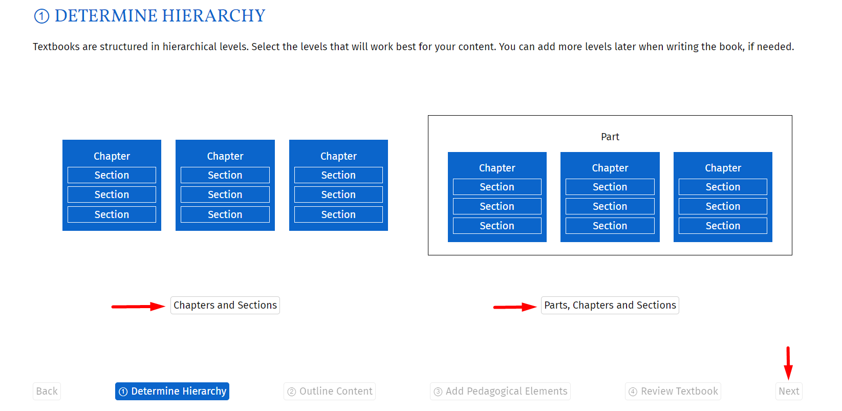 Determine the hierarchical levels for your book. Select chapters and sections for a single-part book or parts, chapters, and sections for a multi-part book. Click "Next."