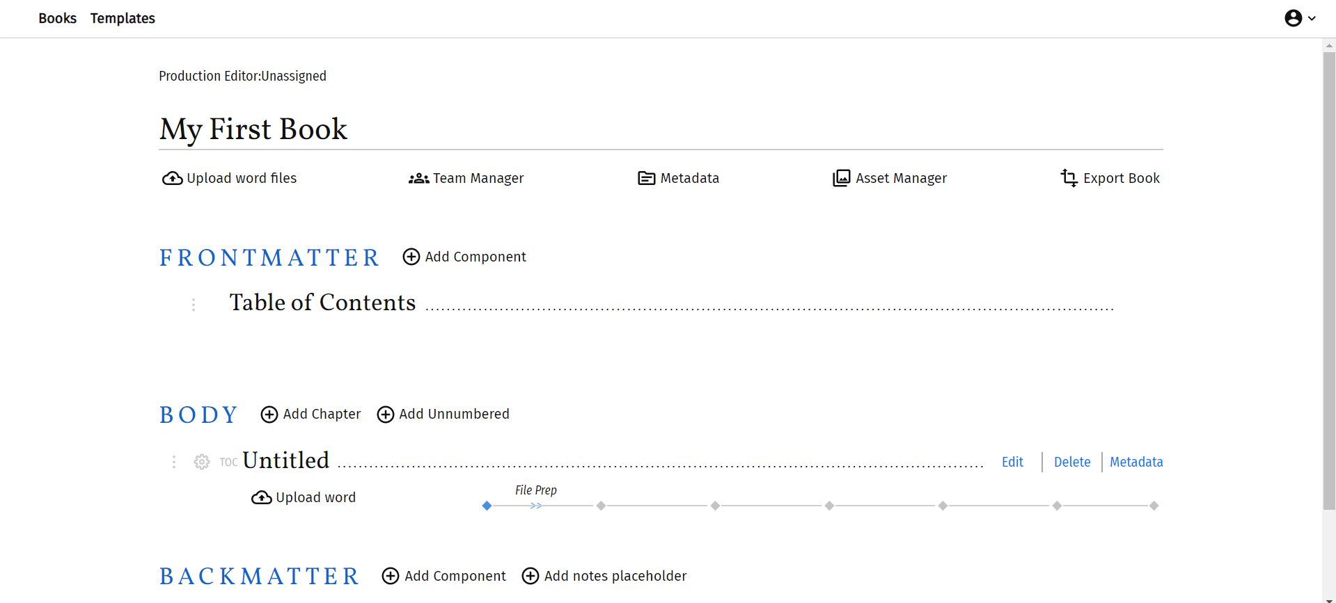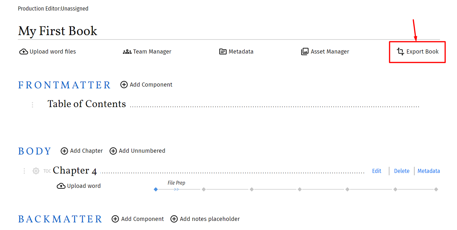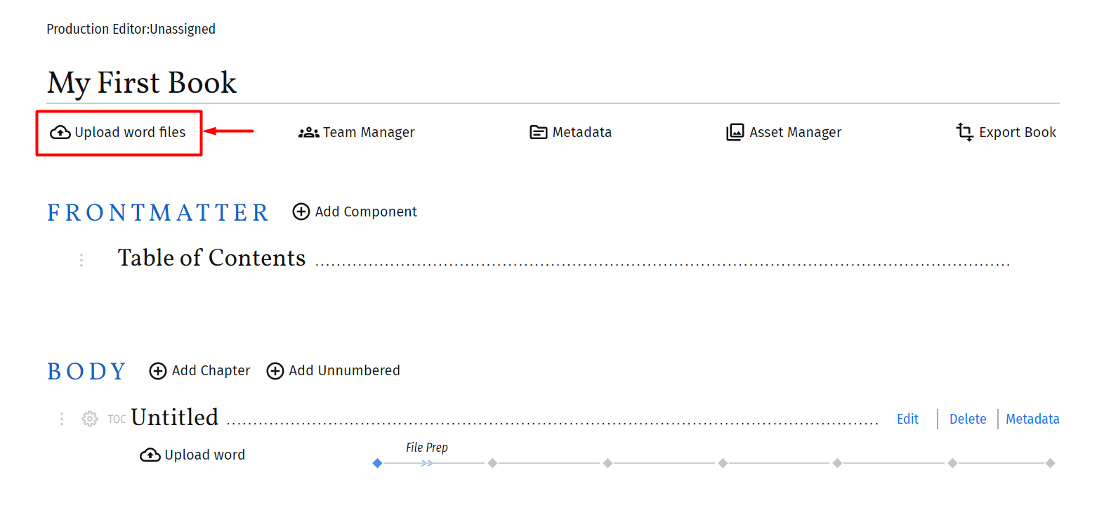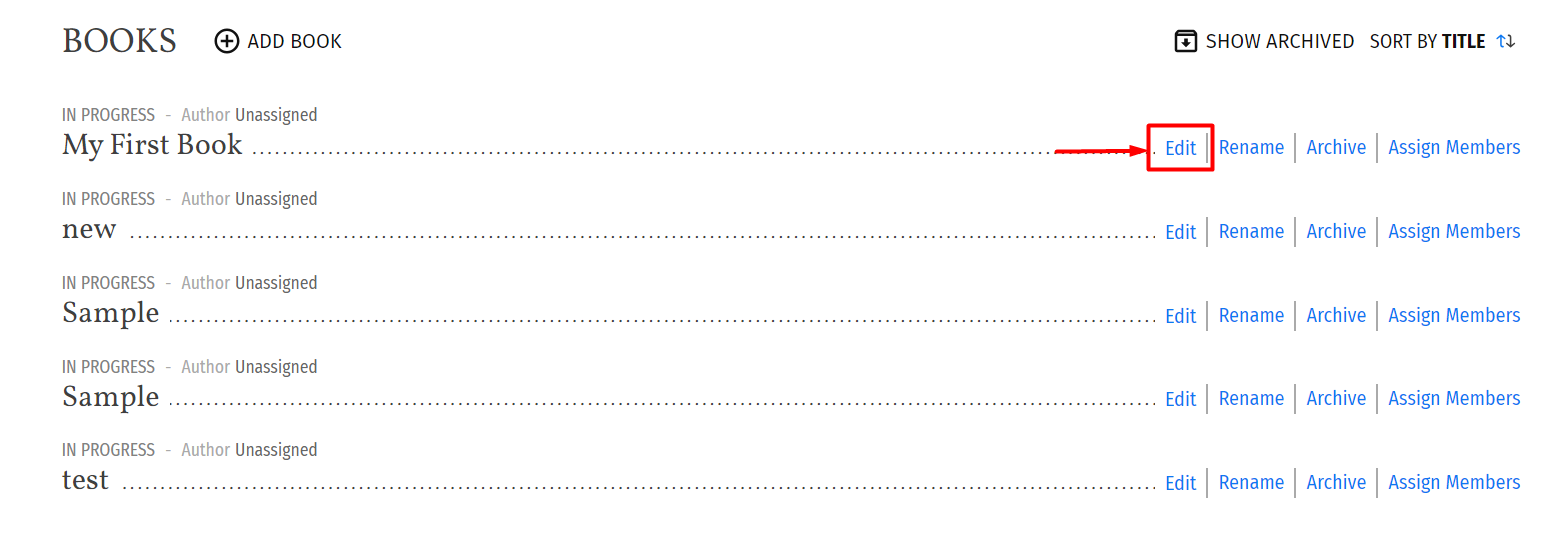 Click on "Edit" next to the book you created. Delete default chapters if you plan to upload DOCX files.