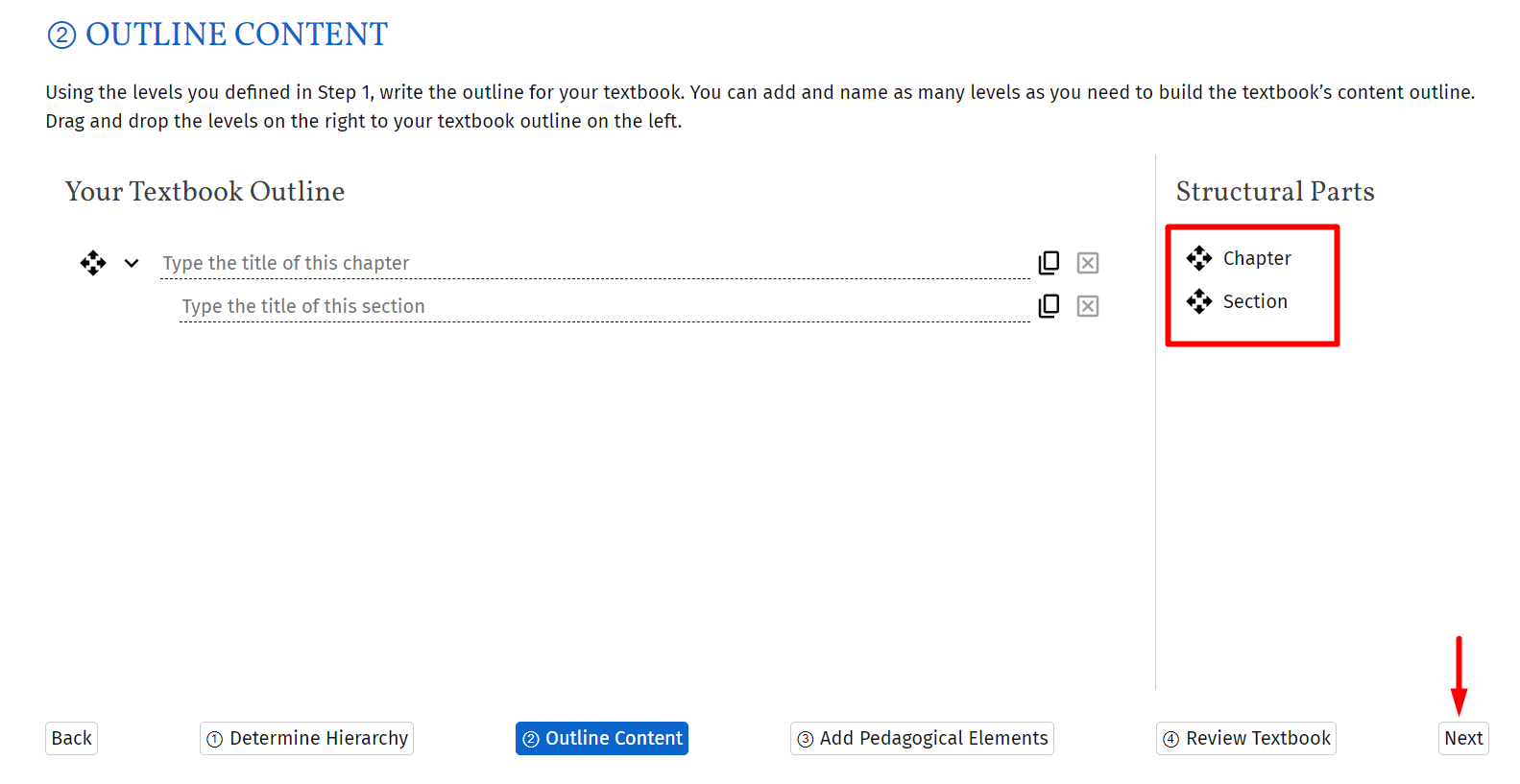 Default structure includes a chapter with a single section. Drag and drop structural parts from the right panel onto the outline section and click on Next.