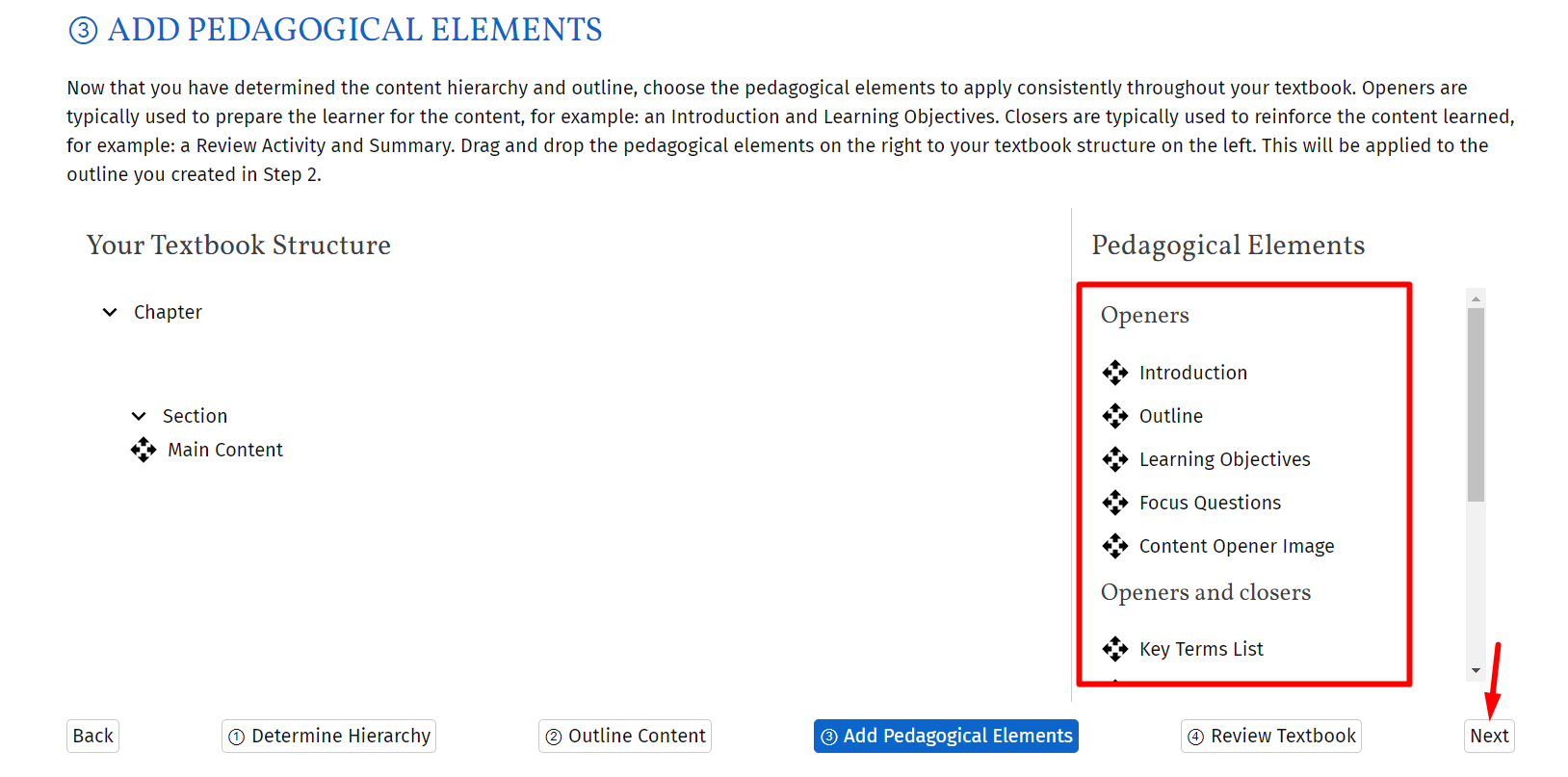 Similar to the previous step, drag and drop pedagogical elements from the right panel onto the left section.